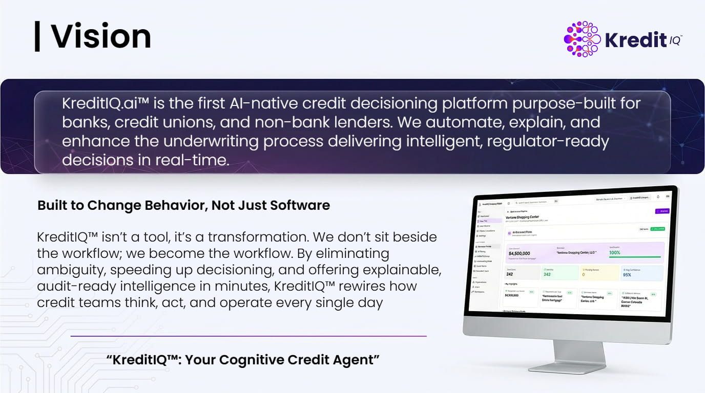 Welcome to the Future of Underwriting KreditIQ is the first AI-native credit decisioning platform built for modern lenders. We don’t sit beside your workflow—we become it. Speed, clarity, and compliance—at the core of every decision.